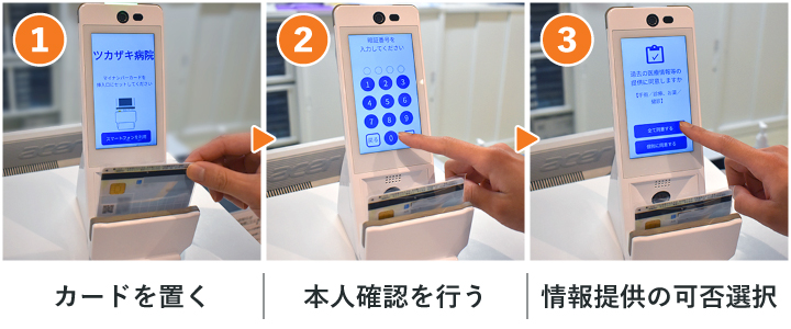 顔認証または暗証番号で本人確認ができ、紙の保険証がなくても受診できます。