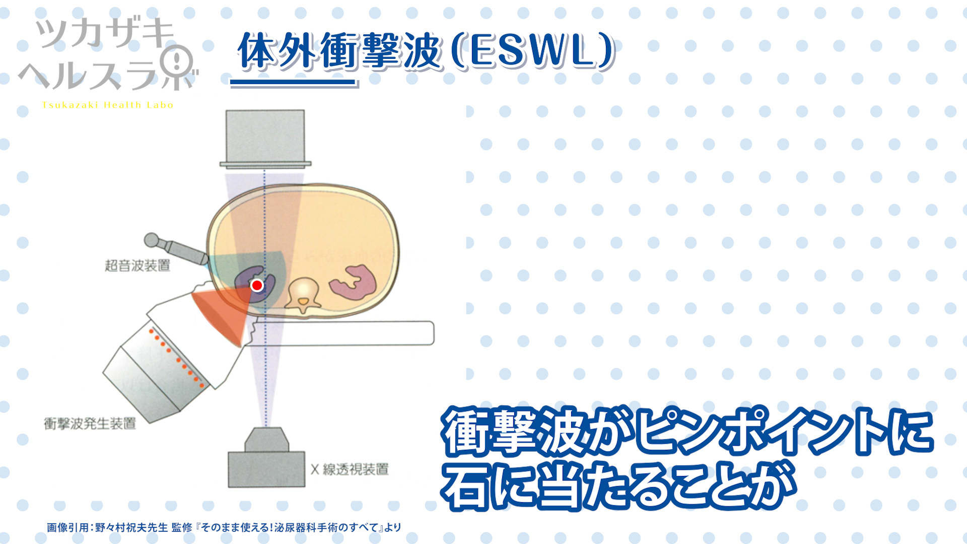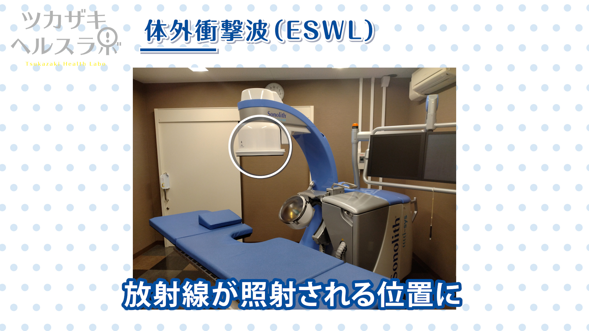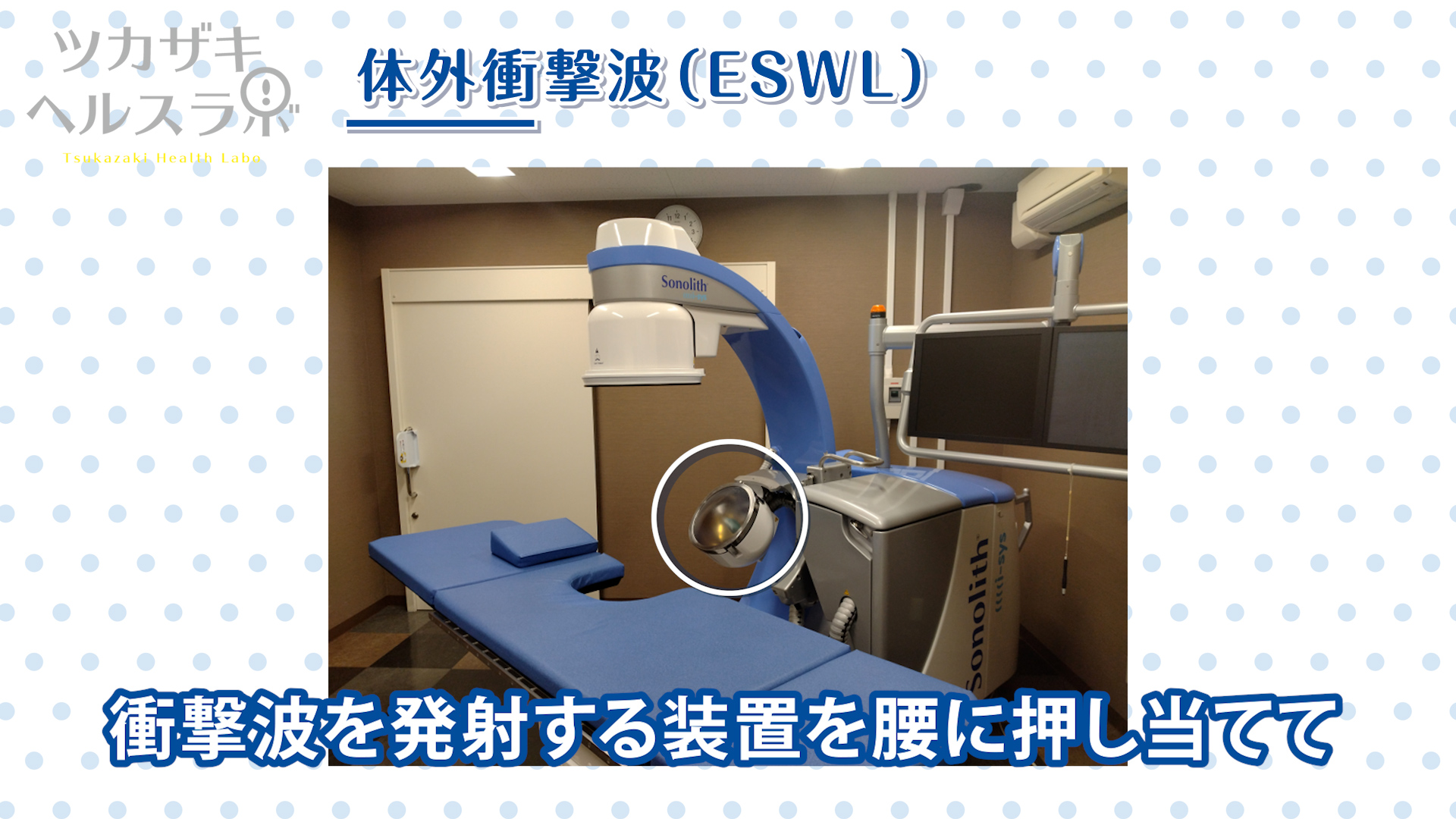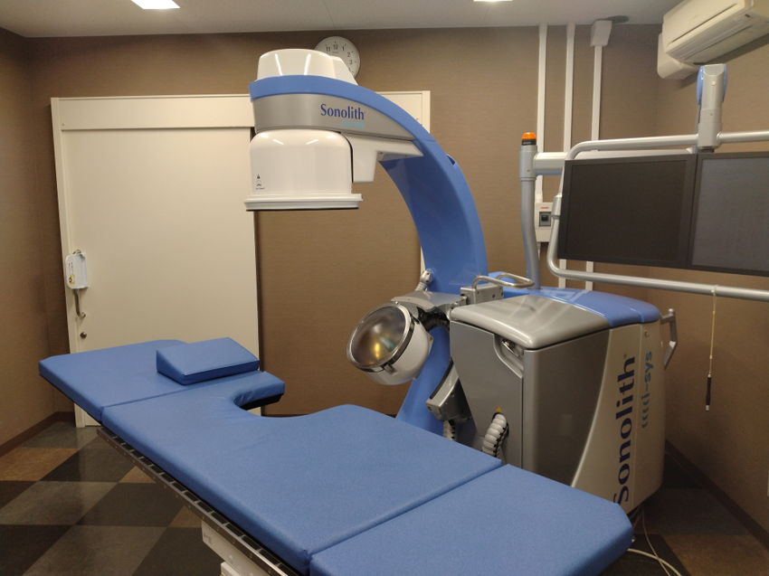 代表的な治療法としては、体外から衝撃波を当てて石を破砕する体外衝撃波(ESWL)といった装置を用いて結石の破砕を行います。