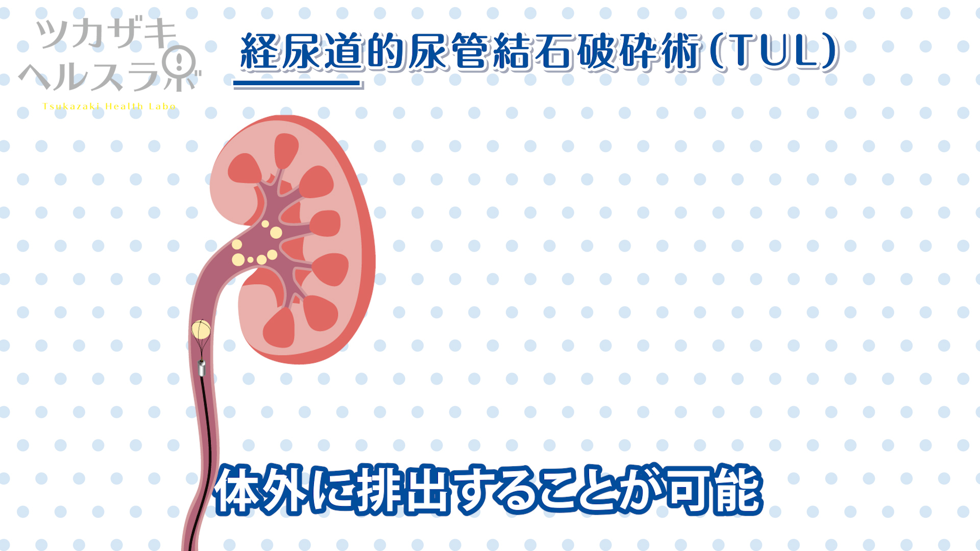 割れた破片の中でも比較的大きな破片に関してはパスケットという石を回収する道具を用いて、尿管・膀胱・尿道を経て体外に排出することが可能です。