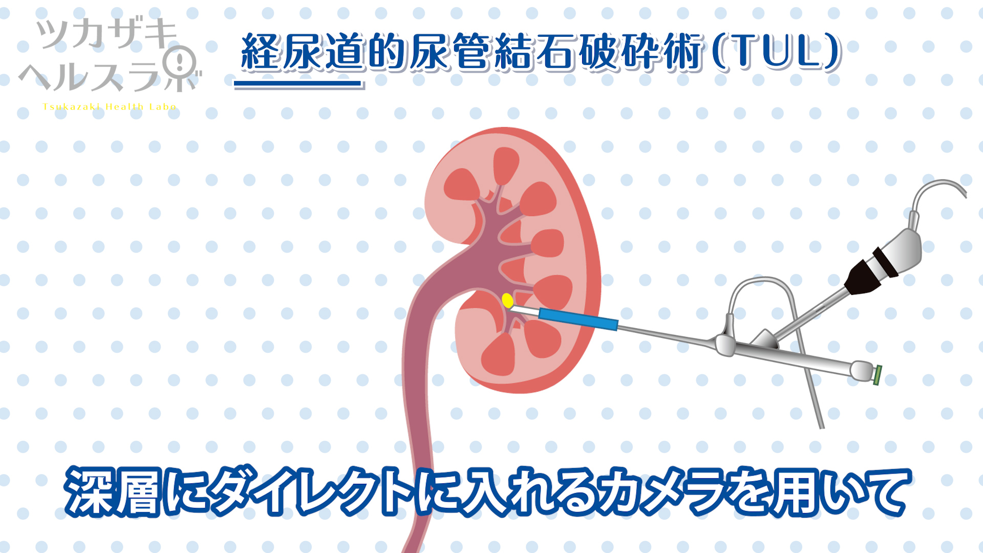 一部分、腎臓の内部でも進んでから屈曲し折れ曲がった下の部分を観察しないといけないポイントになった場合は、軟性鏡はなかなか到達しにくい場所でもあるので、そういった難しい石に関しては深層にダイレクトに入れるカメラを用いて治療を行ったりもします。